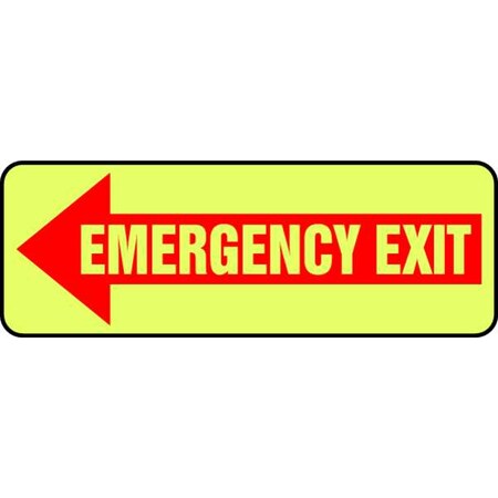 ' Emergency Exit Sign, Subject Matter Exit & Evacuation, Emergency Exit (w/Left Pointing Arrow), Text and Symbol, English, Lumi-Glow Flex, Mounting Style Surface, Height 3-1/2 In., Width 10 In., Glow Yellow/Red on Glow Yellow '