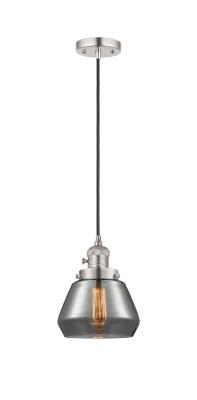 INNOVATIONS 201CSW-PN-G173 1-Light Mini Pendant Polished Nickel. Collection: Franklin Restoration. Style: Industrial, Farmhouse, Modern Contempo, Restoration-Vintage. Metal Finish: Polished Nickel. Metal Finish (Canopy/Backplate): Polished Nickel. Material: Steel, Cast Brass, Glass. Dimension(in): 10(H) x 7(W) x 7(Dia). Min/Max Height (Fixture Height with Cord or Included Stems & Canopy)(in): 12.5/130.5. Wire/Cord: 10 Feet Of Black Textured Cord. Bulb: (1)60W Medium Base,Dimmable(Not Included). Maximum Wattage Per Socket: 100. Voltage: 120. Color Temperature (Kelvin): 2200. CRI: 99.9. Lumens: 220. Glass Shade Description: Plated Smoke Fulton. Glass or Metal Shade Color: Plated Smoke. Shade Material: Glass. Glass Type: Colorful. Shade Shape: Cone. Shade Dimension(in): 6.75(W) x 5.25(H). Fitter Measurement (Glass Or Metal Shade Fitter Size): 3.25 inch Fitter. Canopy Dimension(in): 4.5(Dia) x 0.75(H). Sloped Ceiling Compatible: Yes. California Proposition 65 Warning Required: Yes. UL & ETL Certification: Damp Location.