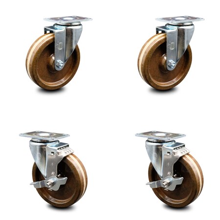High Temperature Swivel Caster Set of 4 with 2 Brakes - 5 Inch High Temperature Phenolic Wheel with Roller Bearing – 3-1/8 Inch x 4-1/8 Inch Overall Top Plate – Service Caster Brand