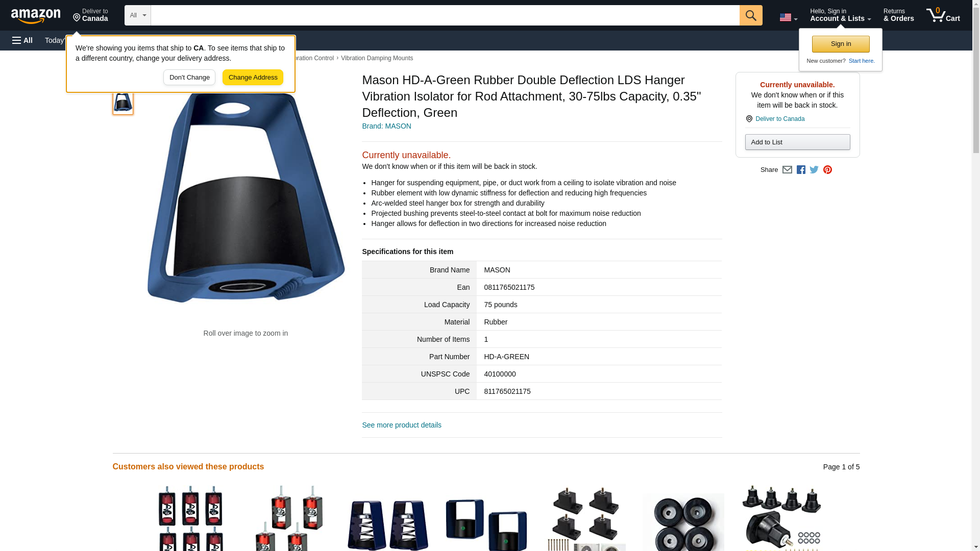 Mason HD-A-Green Rubber Double Deflection LDS Hanger Vibration Isolator for Rod Attachment, 30-75lbs Capacity, 0.35" Deflection, Green