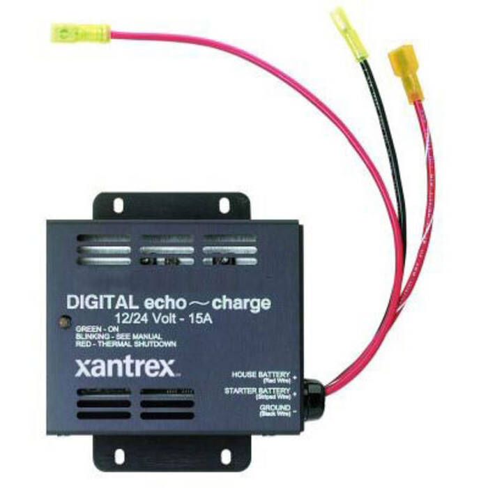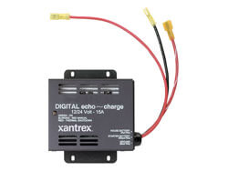 Convenient Dual Battery Bank ChargingXantrex digital echocharge (part#82-0123-01) is designed to charge auxiliary or starting batteries from an inverter/charger or other charging source with limited voltage drop. The Xantrex echocharge detects when the house battery bank is being charged and directs a portion of the charge current to auxiliary or starting batteries. The maximum charger current offered by echocharge is limited to 15 amps.Product Features15 A maximum charge current Automatically adjusts for 12 or 24 volt battery banks (both battery banks must be the same DC voltage and battery type) Automatically switches on/off without affecting the in-house battery bank or over-charging Utilizes excess current from the primary charging source Built-in thermal and over-current circuits Reverse polarity protection Easy three wire installation
