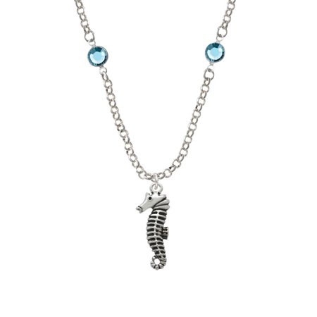 Silver Tone Antiqued Seahorse Hot Blue Crystal Fiona Necklace. Silver Tone, hand enameled charms. Charm size is approx. 1.07 x 0.42 x 0.16 inches (HxWxD) including loop. 3mm Belcher Chain with 4 - 6mm Swarovski Crystal Channel Links. Necklace: 20-22 Inches Adjustable with a Lobster Claw Clasp. This beautiful necklace is elegant with a touch a color for a personalized look. We are a family owned company in the U.S.A. since 1977. PLEASE NOTE: Our products are lead safe, but are not intended for children 14 years and younger.