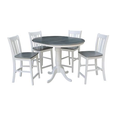 - Dimensions 36''W x 36''D x 35.3''H; Made of solid wood with a butcher block top; Dual-toned white and heather gray finish; Pedestal base with four feet for maximum support; Includes 6" pedestal base extension to make counter height table; Stools feature box seat construction; Ready to assemble