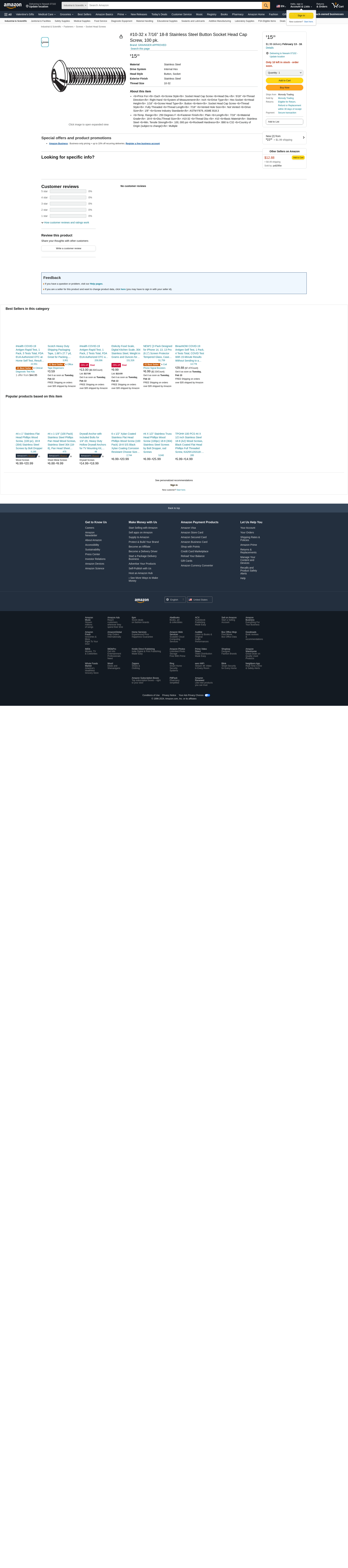 'Socket Head Cap Screw, System of Measurement Inch, Button, Basic Material Stainless Steel, Material Grade 18-8, #10-32, Length 7/16 In., Fastener Finish Plain, Fastener Thread Type UNF, Drive Type Hex Socket, Drive Size 1/8 In., Thread Style Fully Threaded, Thread Direction Right Hand, Thread Length 7/16 In., Head Height 1/16 In., Thread Dia. #10, Package Quantity 100'