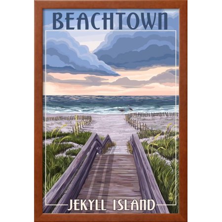 <ul> <li>Title: Beachtown - Jekyll Island, Georgia - Beach Boardwalk Scene</li> <li>Artist: Lantern Press</li> <li>Product Type: Framed Art Print</li> <li>Framed in SOHO Pecan</li> <li>Arrives ready-to-hang for fast, simple installation</li> <li>Framed Size: 22x32 in.</li> <li>Handcrafted in the USA</li> </ul>