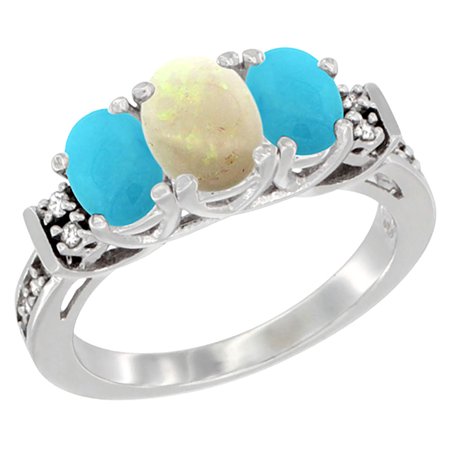 14K White Gold Natural Opal & Turquoise Ring 3-Stone Oval Diamond Accent, sizes 5-10