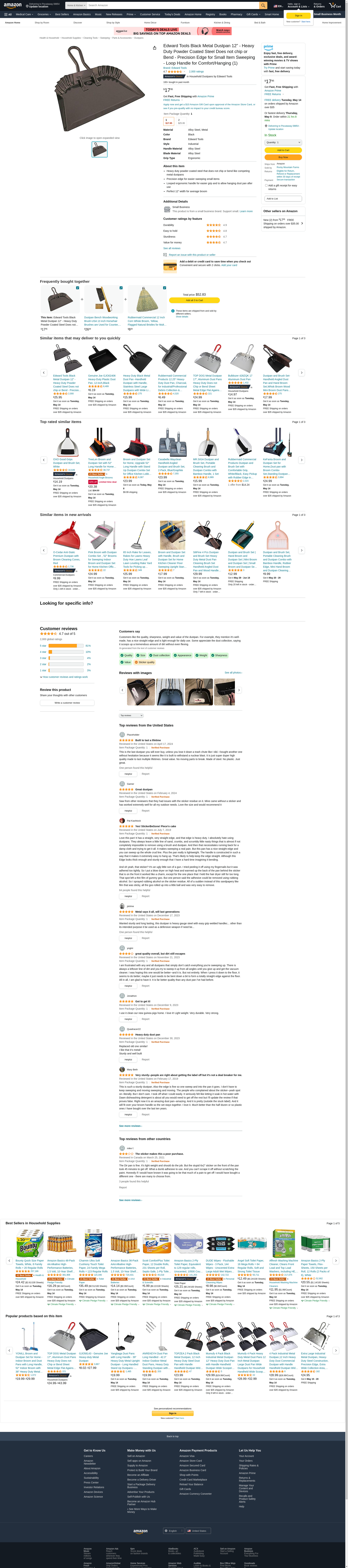 Edward Tools Black Metal Dustpan 12” is the most heavy duty metal dust pan on the market. The premium powder coated steel will not chip or bend like other dust pans on the market. The looped handle is more comfortable and allows the dust pan to be hung up when not in use. This industrial dust pan’s edge is thin enough to sweep small items but thick enough to not bend. A ridge just inside the edge allows the swept items to stay inside while work. Edward Tools Black Metal Dust Pan 12” is the perfect size for a standard broom.