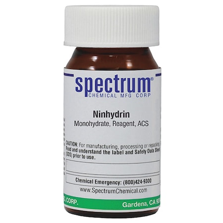 Ninhydrin, Monohydrate, Reagent, ACS, CAS Number 485-47-2, Molecular Weight 178.14, Chemical Formula C9H4O3 x H2O, Chemical Container Material Amber Glass, Chemical Container Type Bottle, Chemical Grade ACS, Chemical Container Size 5 g, Chemical Family Type Analytical Reagents, Shelf Life 24 mo, Shipping Restrictions Chemical Not Regulated For Transport