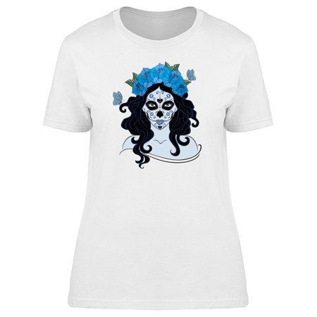 <ul> <li>Brand: Teeblox</li> <li>Girl with Sugar Skull Face Paint in wreath of blue roses</li> <li>White T-shirt 100% COTTON </li> <li>Perfect for this spring season </li> <li>beauty,calavera,carnival,,celebration</li> </ul><p>Country of Origin: Made in Mexico