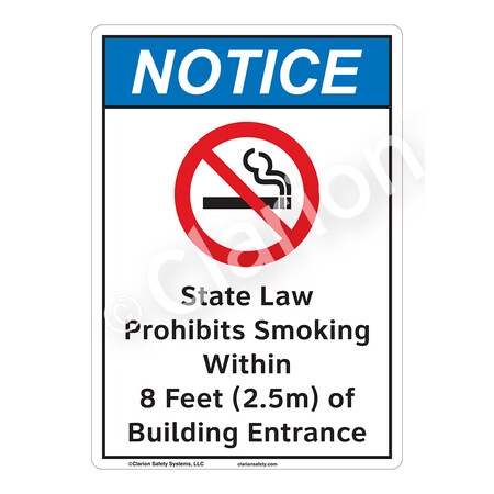 <p><strong>Word Message: </strong><br />State Law Prohibits Smoking Within 8 Feet (2.5m) of Building Entrance </p><p><strong>Description: </strong><br />Clarion Safety Systems brings you high quality notice state law safety signs (ITEM# F1108-) which are produced on premium plastic material and are expertly designed to meet your no smoking sign needs. </p><p><strong>Material Information:</strong></p> <ul> <li><strong>Material</strong>: (S4) Outdoor Weather Tuff Aluminum</li> <li><strong>Base Materials</strong>: .040" Rigid White Aluminum</li> <li><strong>Overlaminate</strong>: 3M .003 Ultra-Clear Weather Tuff UV resistant</li> <li><strong>Mounting Option</strong>: Mounting holes</li> <li><strong>Application</strong>: Indoor/Outdoor</li> <li><strong>MaxTemp</strong> (F): 175</li> <li><strong>MinTemp</strong> (F): -40</li> <li><strong>Chemical Resistance</strong>: Excellent</li> <li><strong>UV Resistance</strong>: Excellent</li> <li><strong>Outdoor durability</strong>: Excellent</li> <li><strong>Storage Stability</strong>: Stable. Optimum storage conditions: 72 F @ 50% relative humidity</li> <li><strong>Expected Life Indoor</strong>: Long term</li> <li><strong>Expected Life Outdoor</strong>: 5 - 10 years (expected outdoor life may vary due to climatic conditions)</li> <li><strong>RoHS</strong>: No</li> <li><strong>CRoHS</strong>: No</li> <li><strong>REACH</strong>: No</li> </ul>