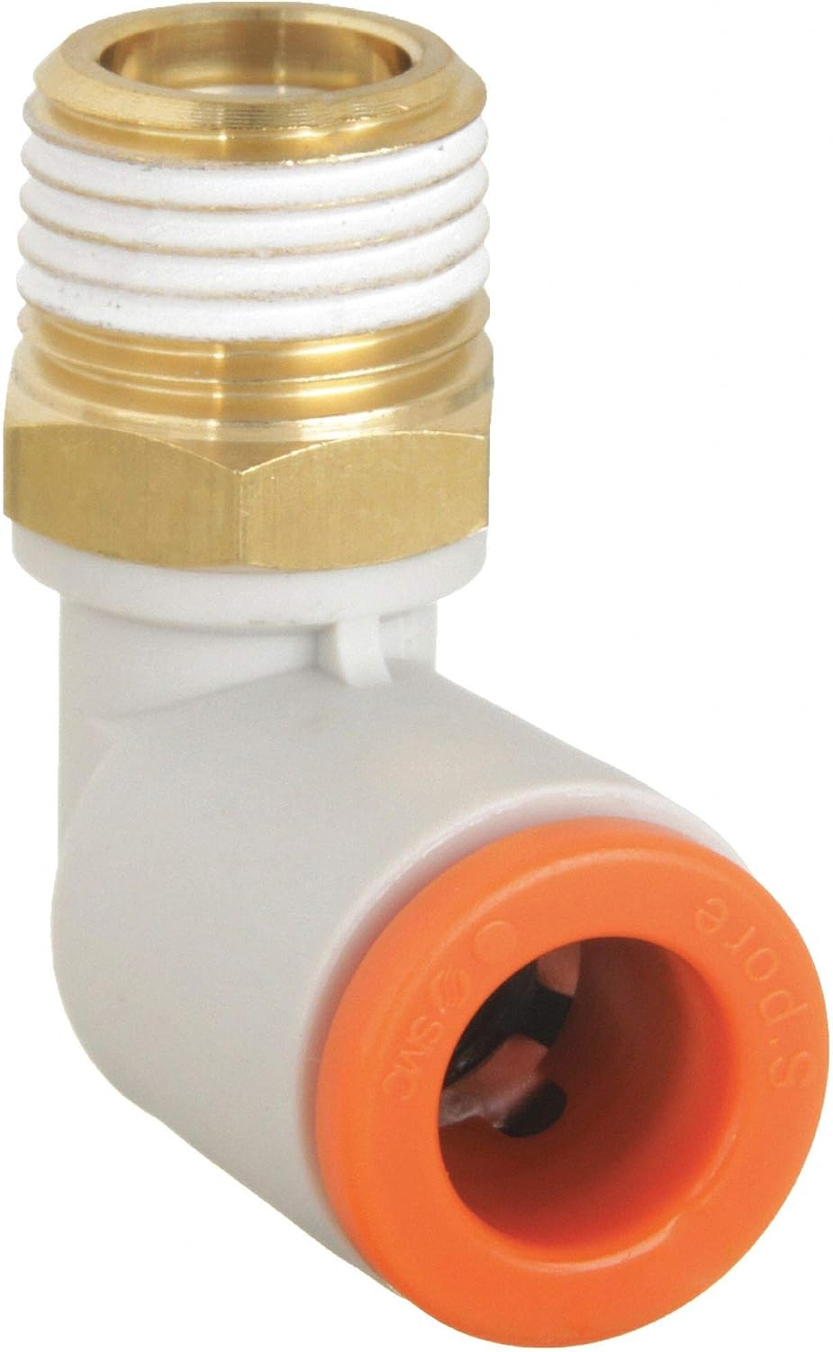 Low disconnecting force helps prevent collet and chuck from biting into and damaging tubing. The body and threaded portion can tum independently of one another for use in confined spaces. For use with polyurethane, polyolefin, nylon, and PTFE tubing. Can be used for positive air pressure as well as vacuum for actuators, air preparation, and directional control valves. Male Elbow, 90 Deg, 1/4 in., TubexMale BSPT