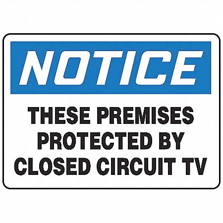Accuform MASE830VA, 10" x 14" Aluminum OSHA Sign: "These Premises Protected By Closed Circuit TV" Prevent theft and vandalism by alerting others of video surveillance. Sign prevents vandalism and theft by alerting others of security protocols employed in the area Traditional OSHA-style signs, tags and labels are the most widely recognized design format in the industry Notice header indicates information considered to be important but not hazard-related Aluminum (VA) - Aluminum withstands wash downs, harsh elements, abusive conditions, and features good chemical, abrasion, and impact resistance. Aluminum is excellent for indoor and outdoor usage, making it ideal for a wide variety of industrial-strength applications. All Aluminum signs feature Accuform's TedLex liquid-based UV-protective coating, included at no charge. TedLex is perfect for indoor and outdoor use, prevents fading, and resists chemicals, abuse, and graffiti. Aluminum signs provide the strength of metal, yet never rust. Aluminum withstands wash downs, harsh elements, and abuse.