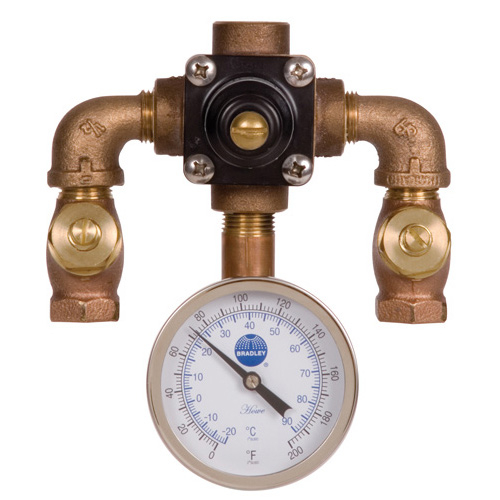Emergency Thermostatic Mixing Valves blend hot and cold water to a tepid flushing temperature (65?-95?). ANSI Z358.1-2004 requires tepid water to assure the eyewash and drench shower do not subject the user to scalding or freezing water temperatures. Bradley valves feature an exclusive fixed cold-water bypass, which allows only cold water to flow through the valve in the event of loss or interruption of hot water supply or thermostat malfunction. Valves are pre-set at 85?F, but can be adjusted to other temperature set points. Bradley Corporation recommends the use of the S19-866, 20 GPM showerhead flow control when sizing drench showers and combination units. Valves are available in four options to accommodate various equipment applications.