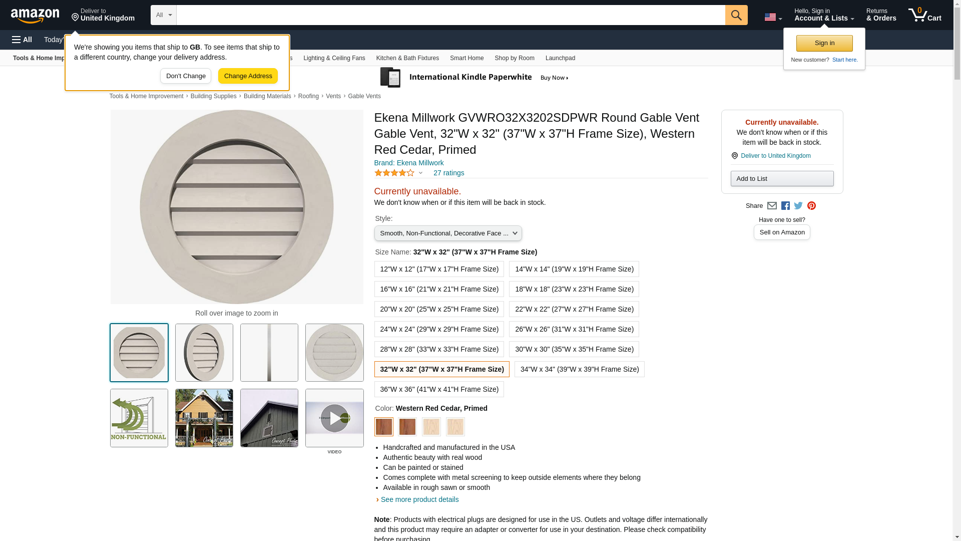 Ekena Millwork GVWRO32X3202SDPWR Round Gable Vent Gable Vent, 32"W x 32" (37"W x 37"H Frame Size), Western Red Cedar, Primed