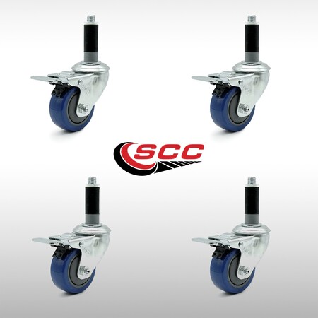 Stainless Steel Polyurethane Swivel Expanding Stem Caster Set of 4 w/3.5" x 1.25" Blue Wheels and 1" Stems - Includes 4 with Total Lock Brakes - 1200 lbs Total Capacity - Service Caster Brand