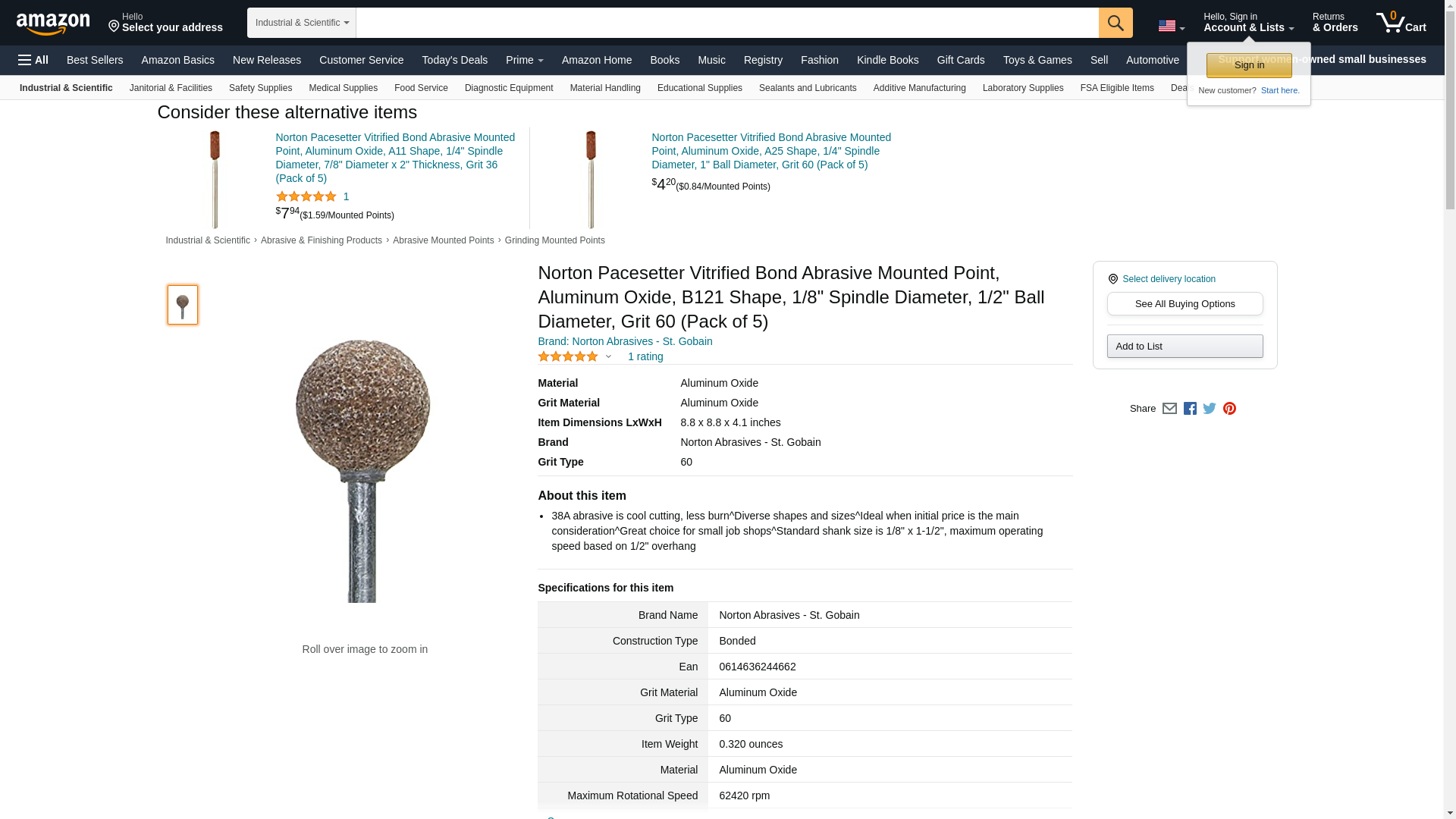 - Price For: Each Item: Vitrified Mounted Point Grit: 60 Grade: Medium Abrasive Material: Aluminum Oxide Spindle Dia.: 1/8" Diameter: 1/2" Thickness: Ball Shape: B121 Series: J2 Max. RPM: 45370 Country of Origin (subject to change): Mexico