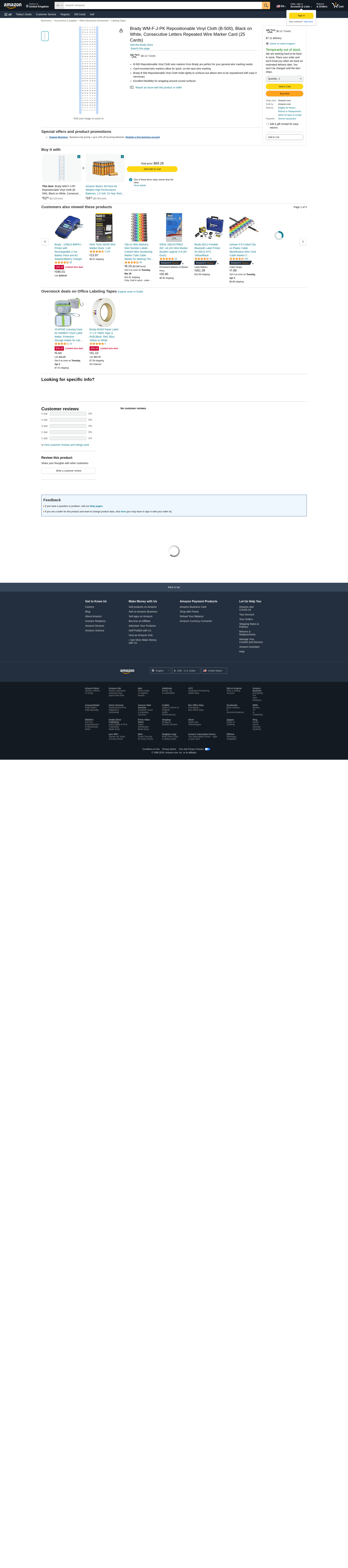 Brady WM-F-J-PK Repositionable Vinyl Cloth (B-500), Black on White, Consecutive Letters Repeated Wire Marker Card (25 Cards)