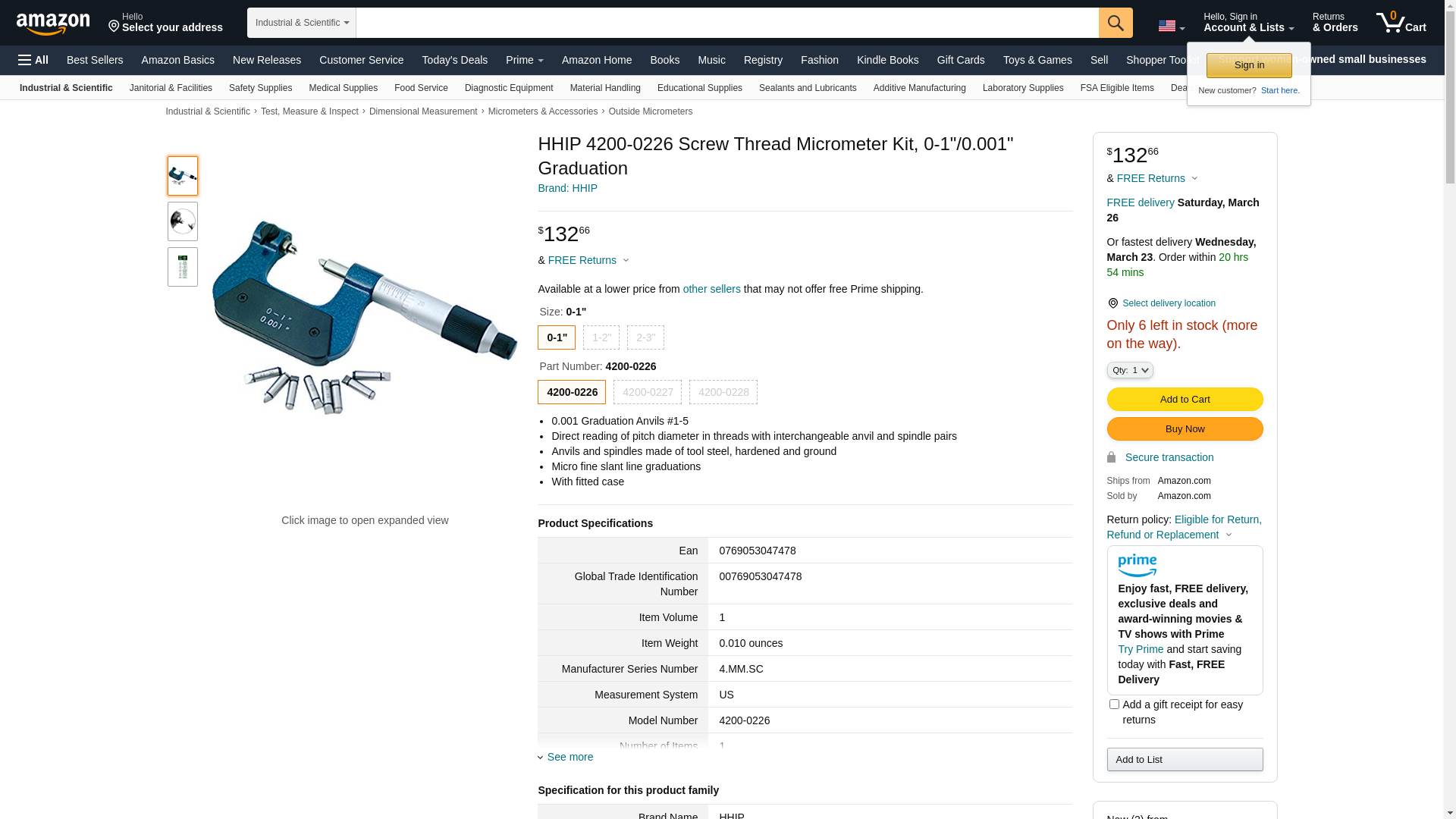 HHIP 4200-0226 Screw Thread Micrometer Kit, 0-1"/0.001" Graduation
