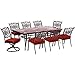 - Set includes six outdoor dining chairs, two swivel rockers, eight seat cushions, and one glass-top dining table