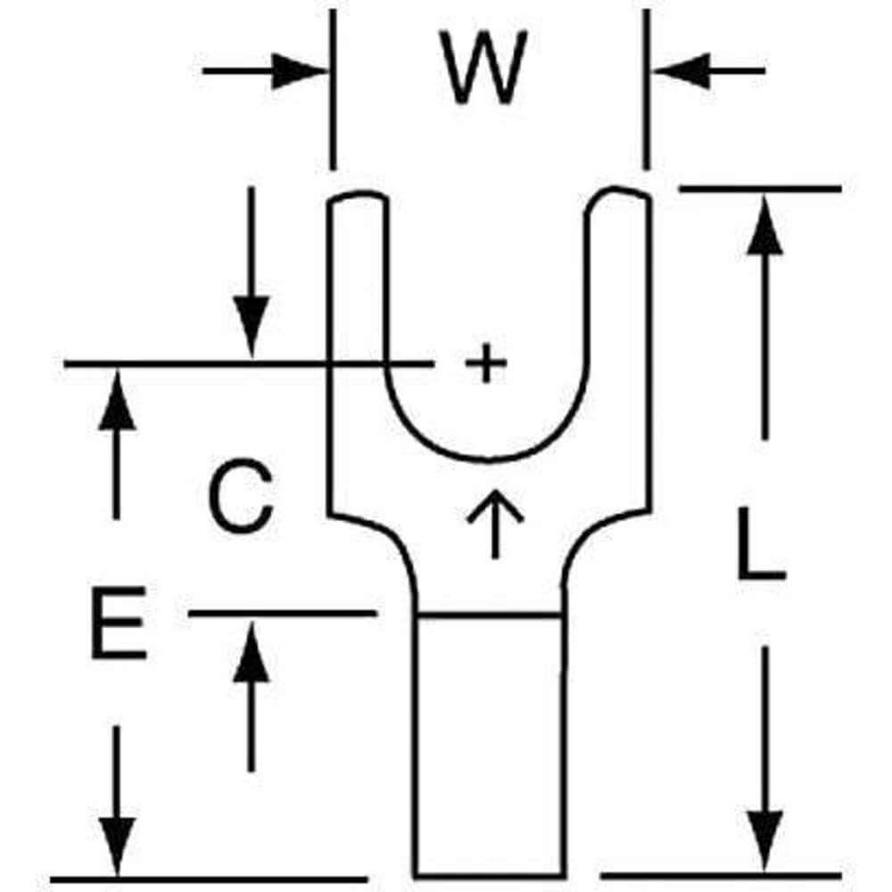 Fork Terminal, Contact Finish Tin, Contact Material Copper, Insulation Color Yellow, Insulation Coverage None, Insulation Material None, Maximum Operating Temperature 347 Degrees F, Maximum Voltage 600 V, Maximum Wire Size 10 AWG, Stud Size #10, Termination Style Crimp, RoHS Compliant Yes, Seam Style Brazed, Standards CSA Certified, UL Listed, Barrel Length 0.25 in, Connection Material Copper, Connection Type Crimp, Insulation Type Non-Insulated, Minimum Wire Size 12 AWG, Overall Length 0.73 in