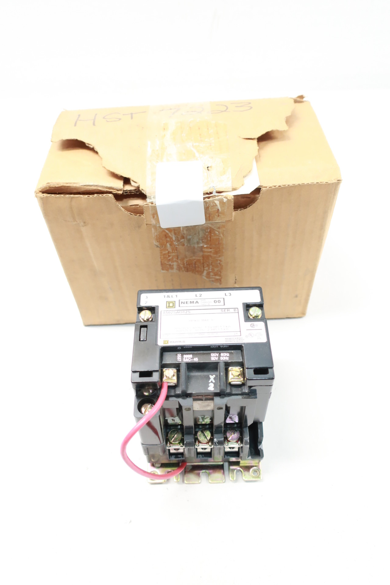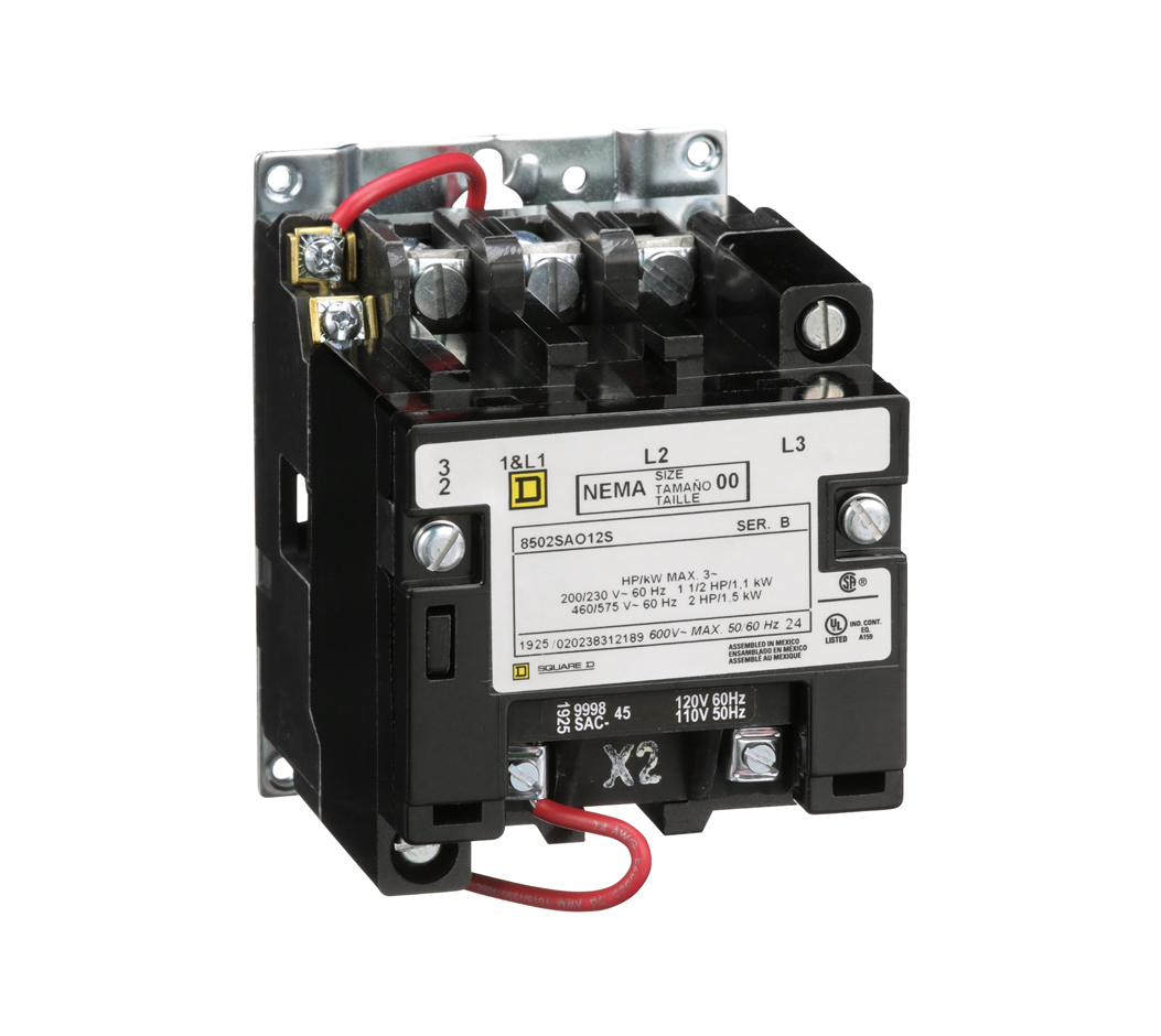 Class 8502 Type S magnetic contactors are used to switch heating loads, capacitors, transformers, and electric motors where overload protection is separately provided. Normally open holding-circuit contact for 3-wire control is provided as standard. Type S contactors are designed for operation at 600 Volts maximum. Used with heating loads, capacitors, transformers, electric motors, and other power loads where overload protection is provided separately. Commonly used in contruction, infrastructure, oil and gas, transportation and other applications. In accordance with NEMA standards.<br /><br /> Item: NEMA Magnetic Contactor<br /> Full Load Amps: 9<br /> Coil Volts: 120VAC<br /> NEMA Contactor Size: 00<br /> Reversing: No<br /> HP @ 3 Phase - 208V: 1-1/2<br /> HP @ 3 Phase - 240V: 1-1/2<br /> HP @ 3 Phase - 480V: 2<br /> HP @ 3 Phase - 575V: 2<br /> Number of Poles: 3<br /> Enclosure NEMA Rating: No Enclosure<br /> Hz: 50/60<br /> Height: 4.34"<br /> Width: 3.22"<br /> Depth: 4.22"<br /> Frame / Series / Class / Code: Class 8502<br /> Standards: UL, CSA<br />