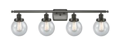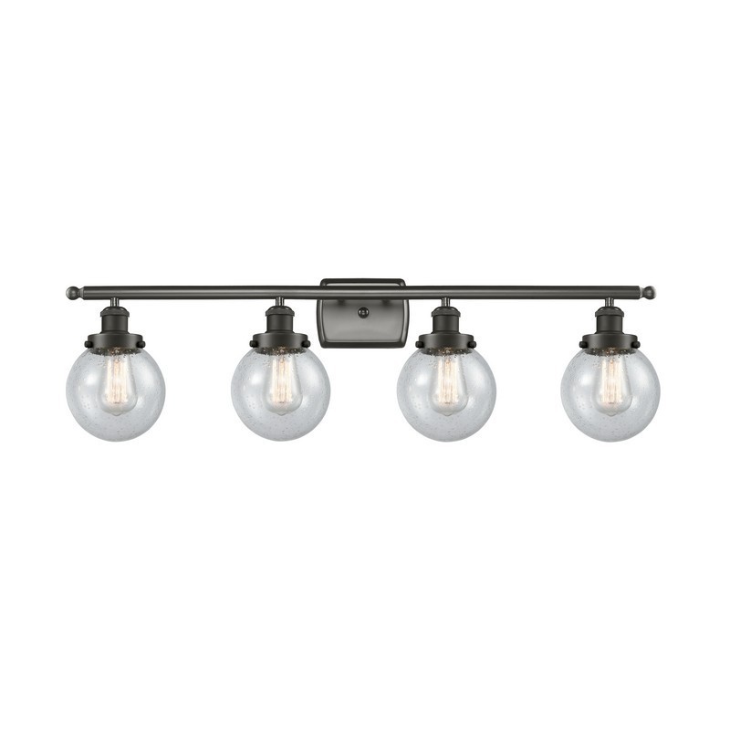 INNOVATIONS LIGHTING 916-4W-OB-G204-6-LED Beacon Bath Vanity Light. Innovations Lighting Beacon 4 Light 36 inch Oil Rubbed Bronze Bath Vanity Light. Collection: Ballston. Material: Steel, Cast Brass, Glass. Metal Finish(Body): Oil Rubbed Bronze. Metal Finish (Canopy/Backplate): Oil Rubbed Bronze. Dimension(in): 11(H) x 36(W) x 8(Ext). Bulb: (4)3.5 Watt LED Vintage Medium Base Bulb Included. Dimmable: Yes. Color Temperature(Kelvin): 2700. Lumens: 350. Color Rendering Index(CRI): 82. Voltage: 120. Glass Shade Description: Seedy Beacon. Glass Type: Seeded. Glass or Metal Shade Shape: Sphere. Glass or Metal Shade Color: Seedy. Shade Material: Glass. Shade Size (Diameter x Height)(in): 6 X 6. Shade Fitter Measurement(in): 3.25 inch Fitter. Canopy Dimensions(in):. Backplate Dimensions(in): 4.5x6x0.75. Certification: UL & ETL, Damp Location.