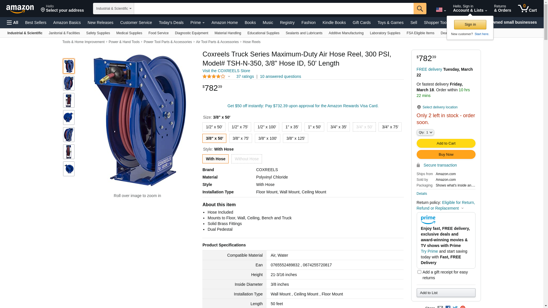 Coxreels Truck Series Maximum-Duty Air Hose Reel, 300 PSI, Model# TSH-N-350, 3/8" Hose ID, 50' Length