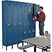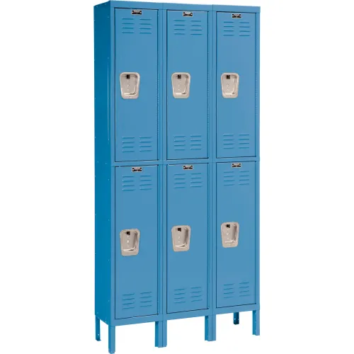HALLOWELL Premium 2-Tier Steel Locker - 12x15x36" Openings - 3 Locker Wide - Set-Up - Marine blueContinuous piano hinge along with hinge- and latch-side door strikes ensure long-term durability.One-piece formed stainless steel recessed handleMulti-point spring-loaded latching mechanismTwo single hooks, one double-hook, and upper hat shelf included16-gauge steel door and frame; 24-gauge steel bodyIncludes 6"H legsNOTE: Set-up lockers are not returnable. Number plates are included with locker purchase: numbers will start with 1 unless specified. Burgundy and green mist lockers have neutral side(s) and back panels, purchase decorative end panels for exposed row endsSHOWN IN PICTURE: 1-tier locker, 3 lockers wide and 2-tier locker, 3 lockers wide in marine blue., Lot of 1