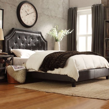 Grace Collection bring in arched bridge top curves are defined by nickel nailhead trimming, adding the elegance looks and class to this furniture pieces <ul> <li>Set includes: One (1) headboard, one (1) footboard, one (1) set of rails, one (1) complete euro slats</li> <li>Materials: Poplar wood </li> <li>Finish: Espresso </li> <li>Upholstery materials: Bonded leather </li> <li>Upholstery color: Black </li> <li>Upholstery fill: Polyurethane foam </li> <li>Arched bridge top curves</li> <li>Nailheads trimming </li> <li>Headboard height: 52.75 inches </li> <li>Footboard height: 13 inches </li> <li>Leg height: 4 inches</li> <li>Height from the floor to the slats: 11 inches </li> <li>Full inside dimension of the frame: 55 inches width x 76 inches length </li> <li>Queen inside dimension of the frame: 61 inches width x 82 inches length </li> <li>Overall full bed dimensions: 83.75 inches length x 59.5 inches width x 52.75 inches height</li> <li>Overall queen bed dimensions: 89.75 inches length x 65.12 inches width x 52.75 inches height </li> <li>Platform bed designed for use with mattress; no foundation required</li> </ul> <br /> <b><i>Assembly required. This product ships in three (3) boxes.</i></b> <br /> <b><i>Mattress, box springs and bedding (comforter, sheets, pillows, etc.) are NOT included</i></b>