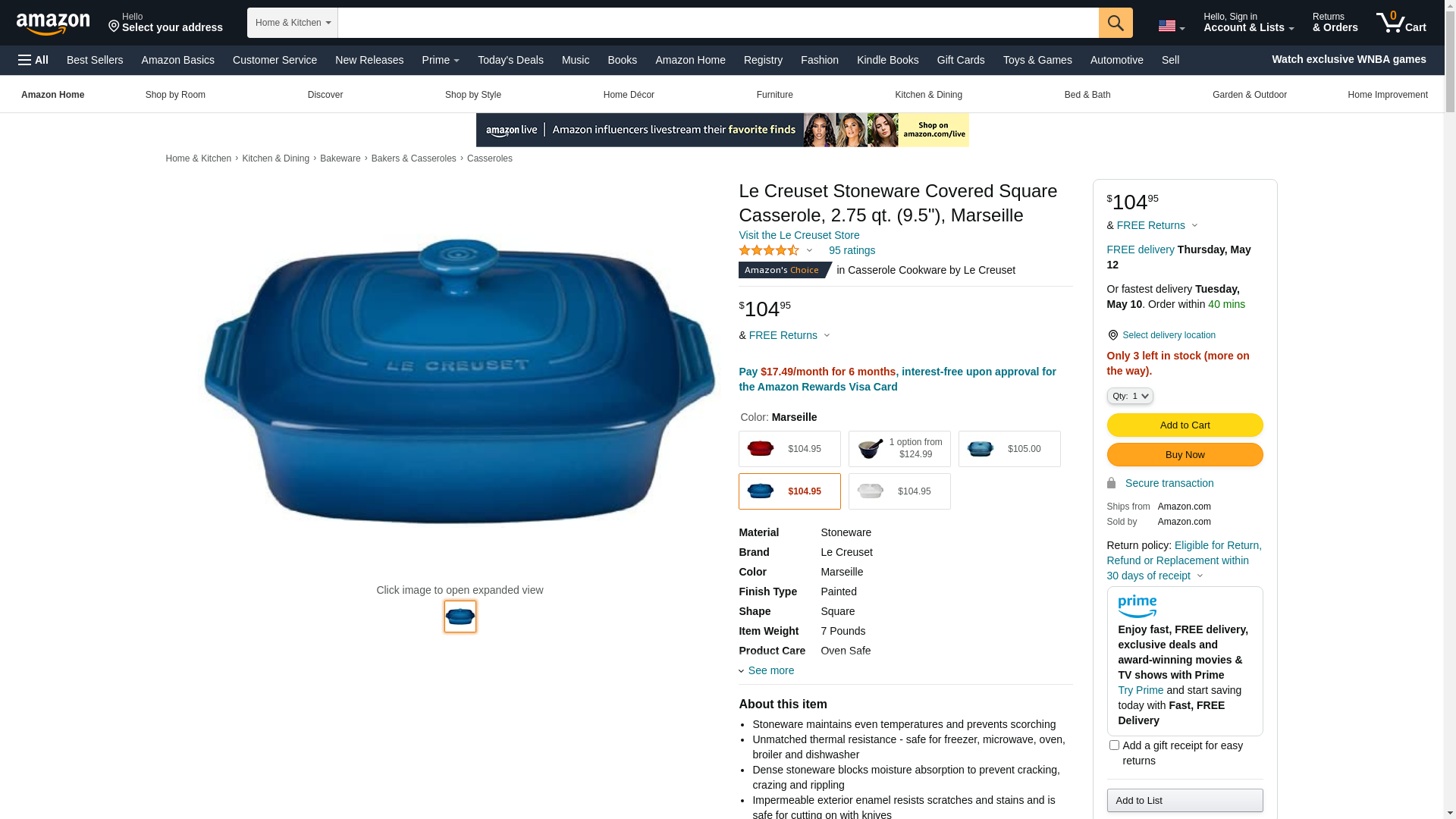 Le Creuset Stoneware Covered Square Casserole, 2.75 qt. (9.5"), Marseille