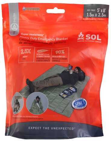 Adventure Medical SOL Heavy Duty Emergency Blanket (0140-1225)<br /><br />The Heavy Duty Emergency Blanket is an ultra-versatile, all-purpose emergency shelter designed for use in the harshest terrain and conditions. Weighing in at only 7.9 oz, this 5' x 8' shelter packs down to a pocket sized package yet can withstand almost any abuse you can throw at it. Wind & waterproof and 90% heat reflective, the Heavy Duty Emergency Blanket will keep you warm and dry and is tough enough to survive multiple adventures.<br /><br />Features:<br /><br />- 2 1/2 Times Thicker, Strength to Rig into a Tarp 2.5 mil,compared to 1 mil blankets, Super Heatsheets fabric is waterproof and windproof and will withstand high winds.<br />- Keeps You Warm, Reflects 90% of radiated body heat to help keep you warm. 100% wind and waterproof to sheild you from the elements.<br />- Unmatched Versatility, Can be used as an emergency blanket, ground cloth, gear cover, emeregncy shelter or whatever suits your needs.