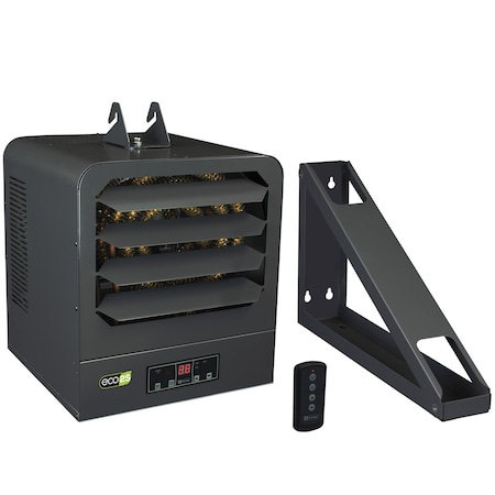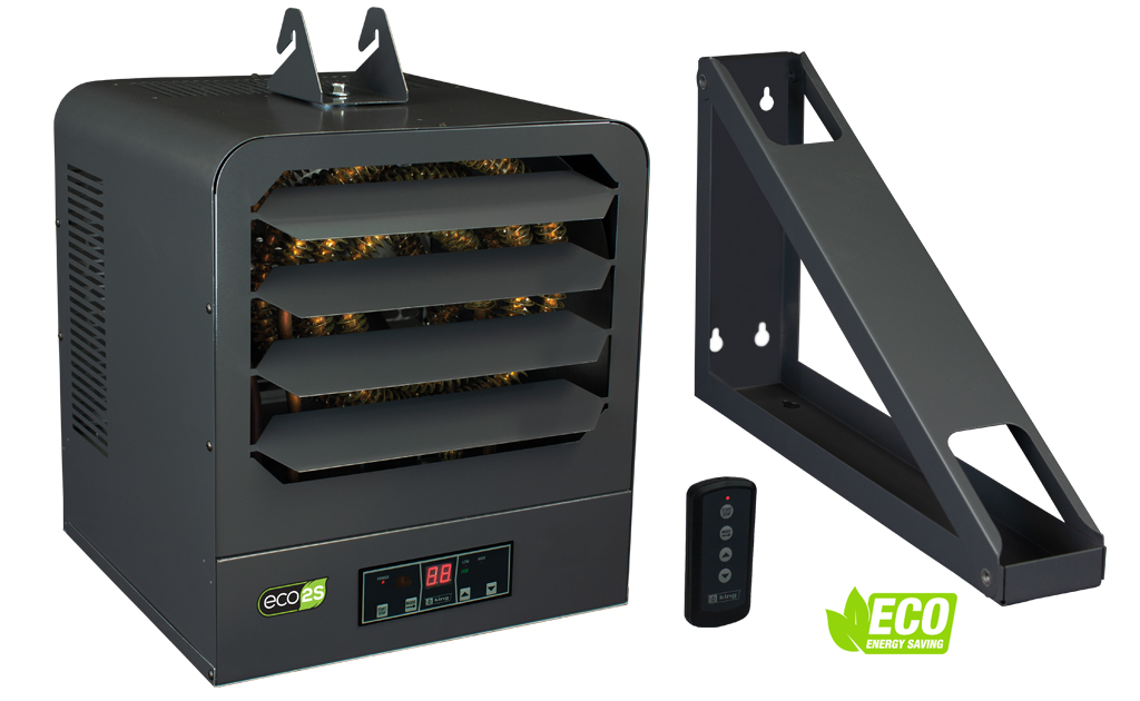 King Electric ECO Unit Heater KB2405-1-B2-ECO w/ Bracket, Remote and Thermostat 240V 5KW 1 PH The ECO2S KB series unit heaters offer unparalleled performance, energy efficiency, and user control by incorporating another King innovation, the built-in ECO2S electronic thermostat with remote control. Units offer energy efficient 2-stage heating, with Eco mode that automatically uses the lowest wattage needed to heat the room. Includes an integrated fan, timer modes, and a remote control for operation ease. These heaters are designed for use as primary or supplemental heat sources in large or exposed areas, including high-rise buildings, stores, warehouses, garages, water treatment facilities, and fire room vaults to prevent freezing. Spiral steel elements and high CFM ensure even air distribution producing cooler element operation which prolongs the life of the heater. By combining the highest quality components, with a dynamically balanced fan blade, the KB ECO2S unit heater will provide years of trouble-free service while keeping heating bills to a minimum. Patented smart limit protection disconnects elements and motor in the event normal operating temperatures are exceeded. Includes universal wall/ceiling bracket for simple installation. Product Details Kilowatts 5 kw Discharge Horizontal Thermostat Built-In Amps High 20.8 A Material Steel Plug Type Hardwire Min Exposure Temperature 45 Amps Low 18 A Voltage 240 / 208 v Description Wall or Ceiling Mount BTU High 17000 Temperature Rise 40 °f Includes Heater, Remote Control, Bracket Motor Type Permanent Lubricated Unit Bearing Motor Phase 1 CFM High 400 cfm Watts High 5000 w Max Exposure Temperature 99 Warranty 5 yr Color Family Gray Weights & Dimensions Coverage Area 450 ft² Width 15 in Height 16-1/2 in Depth 13-1/2 in Max Mounting Height 8 ft Min Mounting Height 6 ft Weight 28.5 lbs Compliance & Certifications Certifications cULus