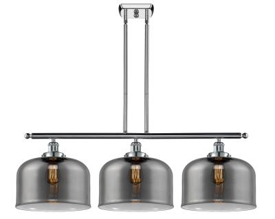 INNOVATIONS LIGHTING 916-3I-PC-G73-L-LED X-Large Bell 3 Light Island Light part of the Ballston Collection. Collection: Ballston. Metal Finish (Body): Polished Chrome. Metal Finish (Canopy/Backplate): Polished Chrome. Glass or Metal Shade Color: Plated Smoke. Material: Steel, Cast Brass, Glass. Shade Material: Glass. Dimension(in): 11(H) x 36(W) x 8(Ext). Canopy Dimension(in): 6(L) x 4.5(W) x 0.75(H). Min/Max Height(With Shade, Cord or Included Stems & Canopy)(in): 20.375/44.375. Wire/Cord: 10 Feet Of Wire. Shade Size(in): 7.875(H) x 12(Dia). Bulb: (3) 3.5 Watt LED Vintage Medium Base Bulb Included. Voltage: 120. Dimmable: Yes. Color Temperature(Kelvin): 2700. CRI: 82. Lumens: 350. Sloped Ceiling Compatible: Yes. Glass Type: Frosted. Glass or Metal Shade Shape: Sphere. Shade Fitter Measurement: Neckless with a 2.125 inch Hole. Style: Industrial, Modern Contempo, Restoration-Vintage, Transitional . Ul Certification Type: Damp Location. Warranty: 2 Year Finish, Lifetime Electrical.