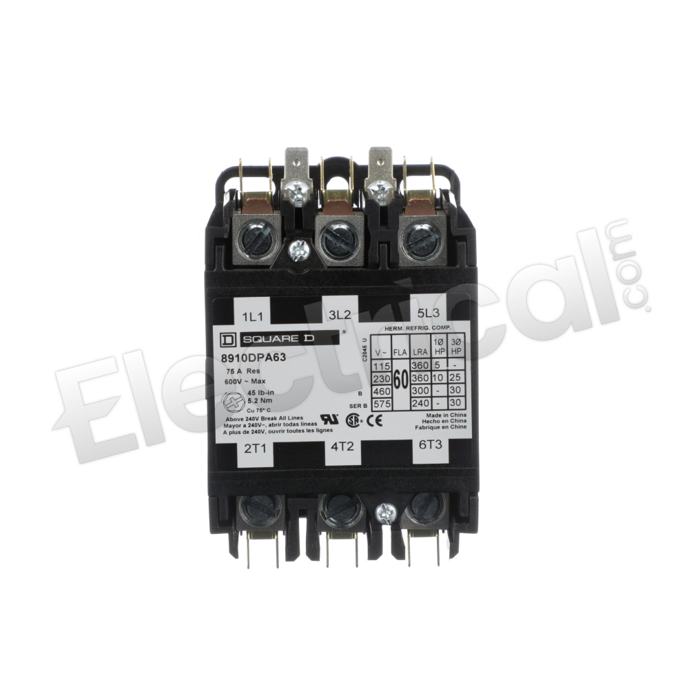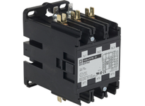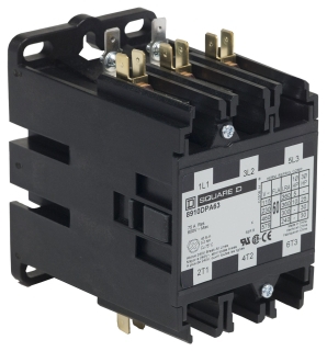 This Square D Magnetic Definite Purpose Contactor is an open style, 3-pole contactor. It has double-break contacts to help improve safety. Auxiliary contact modules snap onto either side for fast expansion. For convenience, the coils can be changed out swiftly without the need for tools. The included box lugs and industry-standard mounting help provide a more reliable connection and easier wiring and installation. A Type-1 enclosure and DIN rail-mounting bracket (sold separately) may help reduce installation costs. 208/240VAC coil volts. 60A (inductive) and 75A (resistive). 600V max. Mechanical life is approximately 500,000 operations. Suitable for heating, air conditioning, and refrigeration applications.<br /><br /> Item: Definite Purpose Contactor<br /> Number of Poles: 3<br /> Full Load Amps-Resistive: 75<br /> Full Load Amps-Inductive: 60<br /> Coil Volts: 208/240VAC<br /> HP @ 1 Phase - 120V: 5<br /> HP @ 1 Phase - 240V: 10<br /> HP @ 3 Phase - 240V: 25<br /> HP @ 3 Phase - 480V: 30<br /> HP @ 3 Phase - 575V: 30<br /> Height: 4.06"<br /> Width: 2.56''<br /> Depth: 3.67"<br /> Enclosure NEMA Rating: No Enclosure<br /> Hz: 50/60<br /> Reversing: No<br /> Includes: Quick Connect Terminal<br /> Standards: UL, CSA, CE