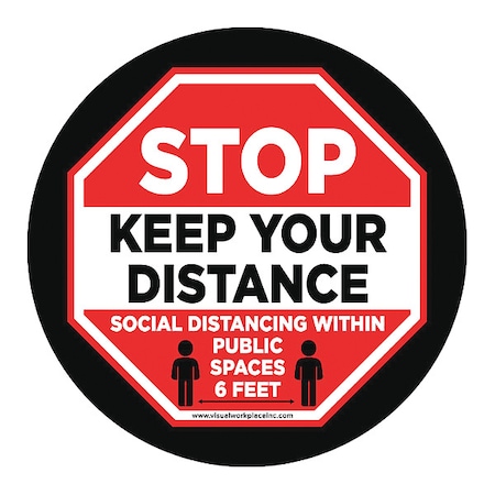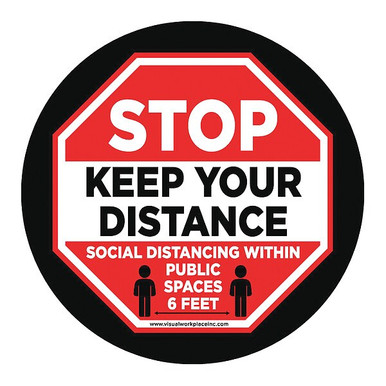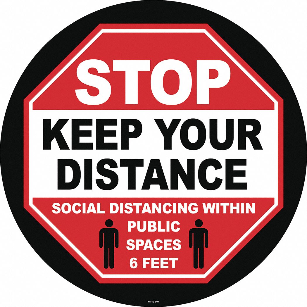 Social Distance Floor Sign, Sign Subject Matter Social Distancing, Height 12 in, Width 12 in, Sign Material Vinyl, Sign Mounting Style Adhesive, Header Stop, Legend Keep Your Distance, Social Distancing Within Public Spaces 6 ft., Printed Language English, Sign Shape Circle