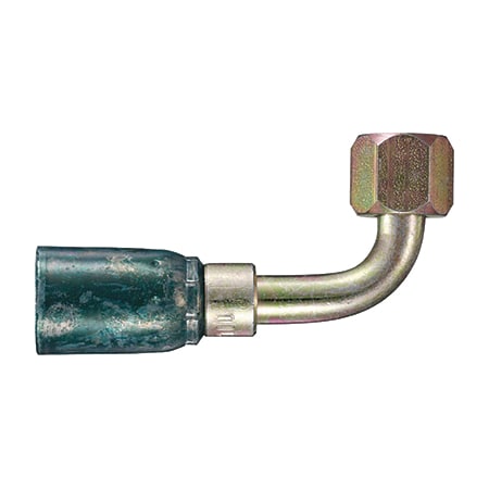 - Adapts 3/8" JIC 37-degree flare female swivel end to 5/16" hose ID at a 90-degree angle