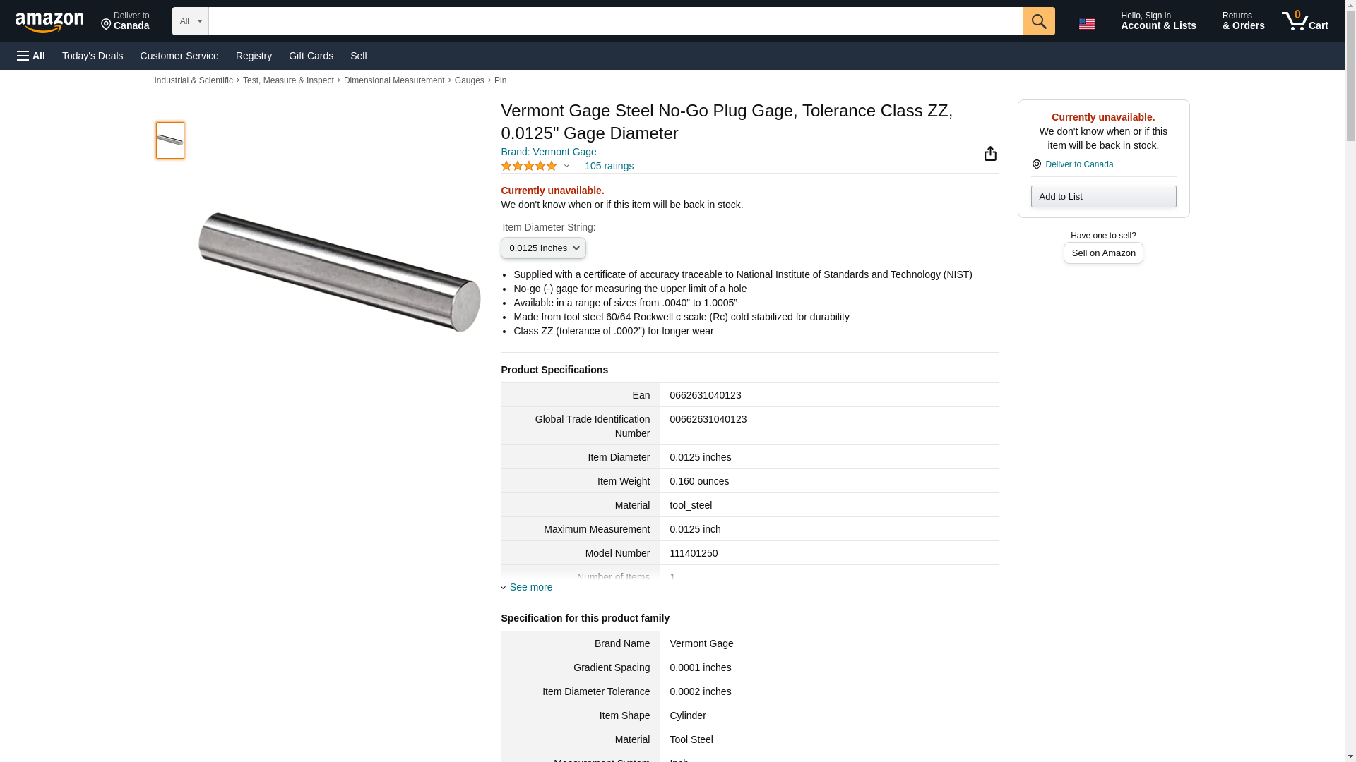 Vermont Gage Steel No-Go Plug Gage, Tolerance Class ZZ, 0.0125" Gage Diameter