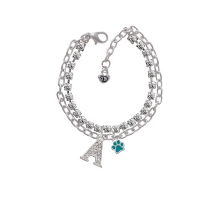 Silver Tone Mini Translucent Teal Paw -A- Double Strand Crystal Cup Chain Madison Charm Bracelet with Beaded Crystal Initial. Silver Tone, hand enameled charms. Charm size is approx. 0.4 x 0.32 x 0.06 inches (HxWxD) including loop. Double Strand Crystal Madison Charm Bracelet is 6.5 Inches with a 1 Inch Extender. Bracelet is made from 4mm link chain and 4mm Clear Crystal Cupchain with Lobster Claw Clasp. Beaded Crystal Initial is approx. 0.72 x 0.48 x 0.10 inches (HxWxD) including loop. Available in A-Z. Please contact us with your order number if you would like to customize the initial. Featured item is an exclusive Delight & Co. design. We are a family owned company for over 35 years in the U.S.A. PLEASE NOTE: Our products are lead safe, but are not intended for children 14 years and younger.