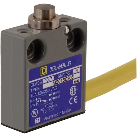 This miniature encapsulated limit switch features a plunger actuator and zinc body construction for heavy-duty durability.<br /><br /> Limit Switch Style: General Purpose Limit Switch<br /> Basic Actuator Style - Limit Switch: Plunger<br /> Actuator Style - Limit Switch: Plunger<br /> Actuator Location - Limit Switch: Top<br /> Item: General Purpose Limit Switch<br /> AC Contact Rating - Limit Switch: 10A @ 300V<br /> DC Contact Rating - Limit Switch: 5A @ 28V<br /> Contact Form- Switches: SPDT<br /> Actuator Length - Limit Switch: 0.70"<br /> Body Height - Limit Switch: 1.75"<br /> Body Width - Limit Switch: 1.58"<br /> Body Depth - Limit Switch: 0.62"<br /> Boot Sealed Actuator - Limit Switch: No<br /> Threaded for Panel Mounting - Limit Switch: No<br /> Body Style - Limit Switch: Miniature<br /> NEMA Rating: 1, 2, 4, 6, 6P, 12, 13<br /> Wiring Entry: Potted Cable<br /> Electrical Connection: 6 ft. Cable, Side Exit, 4 Wire<br /> IP Rating: 67<br /> Movement: Vertical<br /> Travel: 0.19"<br /> Series: 9007MS<br /> Operating Temp. Range: -4 Degrees to 221 Degrees F (-20 Degrees to 105 Degrees C)<br /> Body Material: Zinc<br /> Operating Force: 5.00 in.-lb.<br /> Standards: UL, CSA, CE