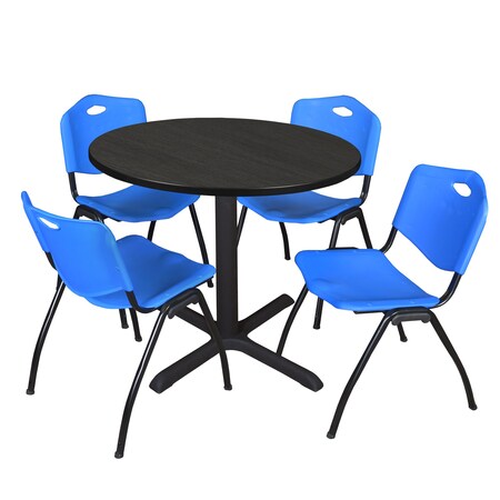 - Versatile table & chair set includes one 36-inch round Cain table and 4 Blue "M" Stack Chairs