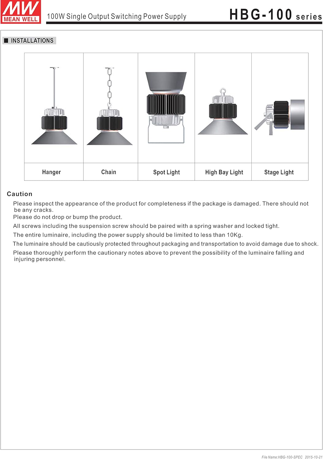 HBG series are high performance LED power supplies specially designed for the high/low bay lighting and spot lighting applications. Featuring with circular shape, these series are easy to be assembled with the mechanical structure of high/low bay lighting fixtures. The enclosures can be perfectly configured with the heat sink of lighting fixtures and provide excellent heat dissipation ability, which solve the mechanism limits of old style bay lighting systems using slim shape LED power supplies. (HBG-60 also offers models in PCB type, allowing a better variety for lighting module design consideration.) As long as the temperature on the top of the enclosure can be controlled under 70℃, the power supply service life could be guaranteed up to 40,000 hours. Features: <br>HBG-60: 90~295VAC input; HBG-100~240: 90~305VAC input <br>Built-in active PFC function <br>High efficiency up to 93.5% <br>Protections: Short circuit / Over current / Over voltage / O ver temp. (Short circuit / Over temp. for HBG-60) <br>Output current adjustable through internal potentiometer <br>Suitable for dry, damp, and wet location <br>Two configurations for HBG-60(constant current mode): Blank-Type: Enclosed type(plastic enclosure); P-Type: PCB type HBG-60 HBG-100 HBG-160 HBG-240 <br>Multiple models for HBG-100/160/240 (aluminum case) A-Type: IP65 rated. Constant current level can be adjusted through internal potentiometer B-Type: IP67 rated and built-in 3 in 1 dimming function (1~10VDC, PWM signal, or resistance) Blank-Type: IP67 rated. Cable for I/O connection E-Type(option): IP67 rated. Can be fixed by steel support, contact MEAN WELL for details (HBG-100/160 only) <br>5 years warranty