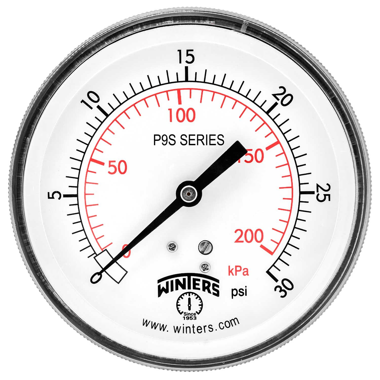 Winters P9S 90 Series Steel Pressure Gauge with Removable Lens, 0-30 psi/kpa, 3-1/2" Dial Display, +/-2-1-2% Accuracy, 1/4" NPT Center Back Mount