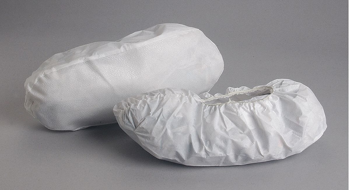'Shoe Covers, Waterproof Yes, Slip Resistant Yes, Shoe and Boot Cover Height Range Ankle, Shoe and Boot Cover Fits Shoe Size 4 to 11, Shoe and Boot Cover Primary Material PVC/Vinyl, Closure Type Elastic Top, Size Universal, Material Vinyl, Height 5 In., Color White, Fabric Weight 1.77 oz./sq. yd., Seam Style Serged, Package Type Bulk, Resists Water, Dry Particulate, Standards ASTM D751, Metal Detectable No, Package Quantity 200'