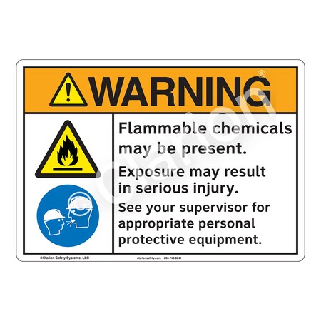 <p><strong>Word Message: </strong><br />Flammable chemicals may be present. Exposure may result in serious injury. See your supervisor for appropriate personal protective equipment. </p><p><strong>Description: </strong><br />Clarion Safety Systems brings you high quality warning flammable chemicals safety signs (ITEM# F1258-) which are produced on premium plastic material and are expertly designed to meet your chemical hazard sign needs. </p><p><strong>Material Information:</strong></p> <ul> <li><strong>Material</strong>: (S2) Outdoor Weather Tuff Plastic</li> <li><strong>Base Materials</strong>: .060" Rigid White Plastic</li> <li><strong>Overlaminate</strong>: 3M .003 Ultra-Clear Weather Tuff UV resistant</li> <li><strong>Mounting Option</strong>: Mounting holes</li> <li><strong>Application</strong>: Indoor/Outdoor</li> <li><strong>MaxTemp</strong> (F): 140</li> <li><strong>MinTemp</strong> (F): 32</li> <li><strong>Chemical Resistance</strong>: Excellent</li> <li><strong>UV Resistance</strong>: Excellent</li> <li><strong>Outdoor durability</strong>: Excellent</li> <li><strong>Storage Stability</strong>: Stable. Optimum storage conditions: 72 F @ 50% relative humidity</li> <li><strong>Expected Life Indoor</strong>: Long term</li> <li><strong>Expected Life Outdoor</strong>: 5 - 10 years (expected outdoor life may vary due to climatic conditions)</li> <li><strong>RoHS</strong>: No</li> <li><strong>CRoHS</strong>: No</li> <li><strong>REACH</strong>: No</li> </ul>