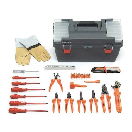 Insulated Tool Kit, Tool Storage Type Tool Case, Measurement Type SAE, Drive Size 1/4 in, Number of Pieces 27, Pliers Included Diagonal Cutting, Flat Nose, Half round, Linemans, Screwdrivers, Keys, and Bits Included (2) Phillips Screwdrivers, (4) Slotted Screwdrivers, Sockets, Drive Tools, and Accessories Included (1) Accessory, (1) Drive Tool, (3) Socket Bits, (5) Sockets, Wrenches Included Adjustable Wrenches, Cutting Tools Included None, Plumbing Tools Included None