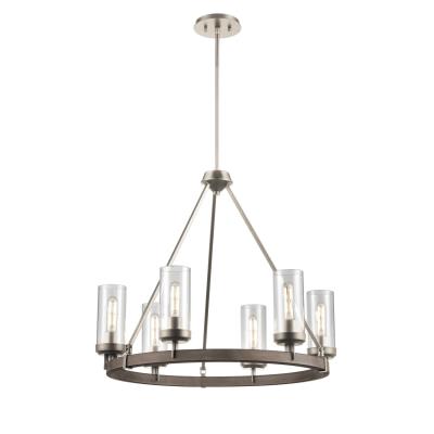- Modern rustic chandelier in brushed nickel and barnwood with glass shade