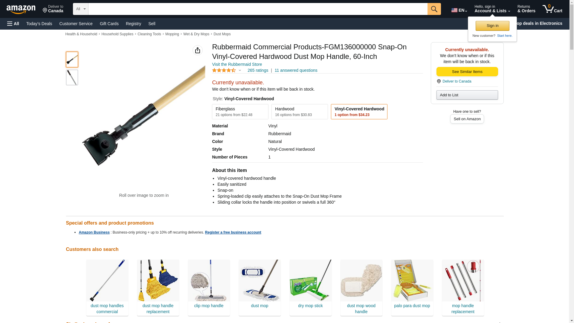 Rubbermaid FGM136000000 Mop Handle Snap-On Dust Mop Handle 60"L vinyl-covered wo