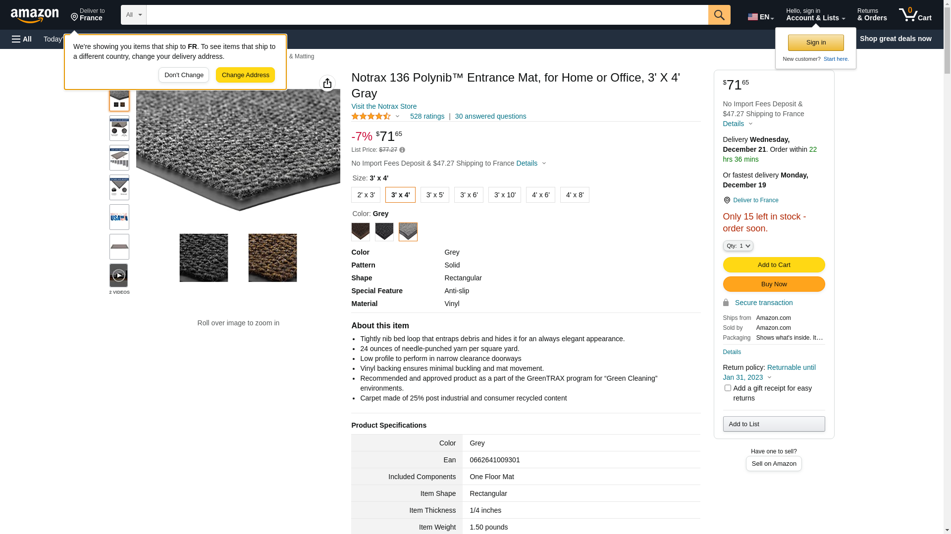Notrax 136 Polynib Entrance Mat, for Lobbies and Indoor Entranceways, 3' Width x 4' Length x 1/4" Thickness, Gray