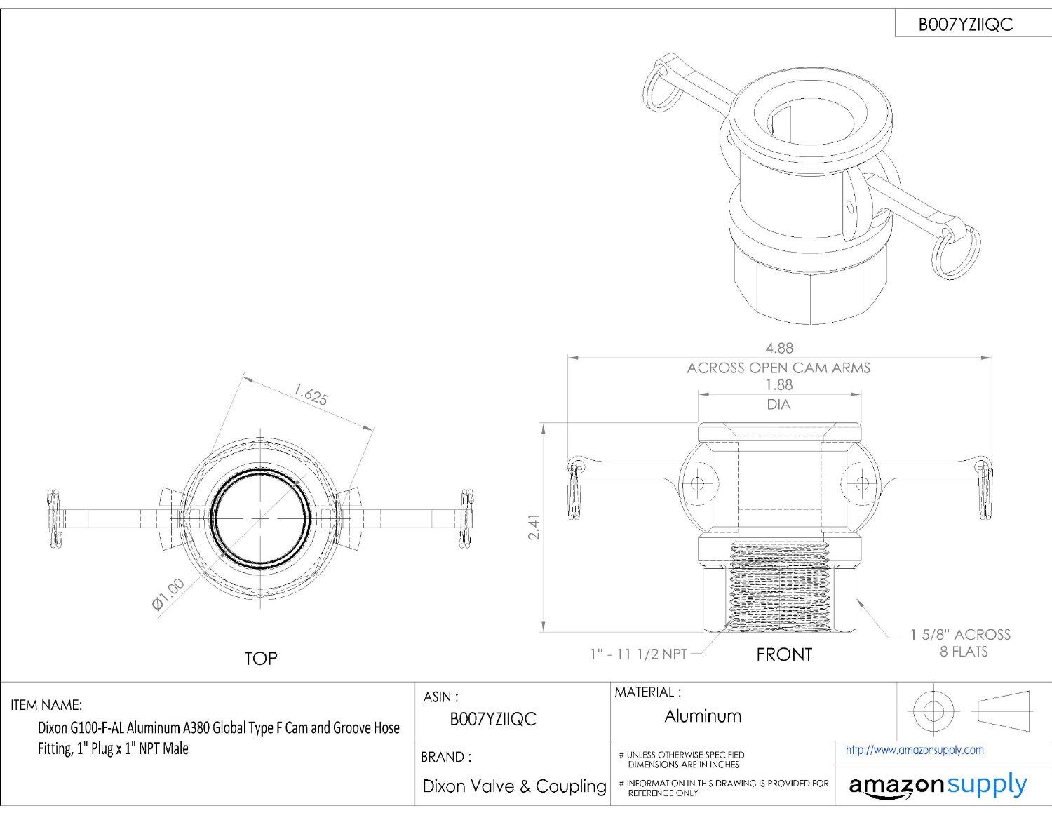 <p><strong>Dixon, G100-F-AL, 1" A380 Permanent Mold Aluminum Global Cam & Groove Type F Adapter X Male NPT</strong></p><p><strong>Applications</strong></p><ul><li>Designed for use with liquids</li></ul><p><strong>Specifications</strong></p><ul><li>Designed to interchange with all products produced to A-A-59326D</li></ul><p><strong>Features</strong></p><ul><li>Made to Dixon specifications and branded Dixon</li></ul><p><strong>How it works</strong></p><ul><li>To make a connection, simply slide the adapter into the coupler and with normal hand pressure, press the cam levers down.</li><li>Uncoupling is as quick and simple as coupling. Just lift the cam arms and remove the adapter.</li></ul><p><strong>Safety notes</strong></p><ul><li>Under no circumstances should cam and groove couplings be used for compressed air or steam service!</li><li>Pressure rating is based on the seal of the mating part</li><li>Pressure rating recommendations are based on the use of mating Dixon fittings at ambient temperature 70°F / 21°C with a standard seal installed.</li></ul>