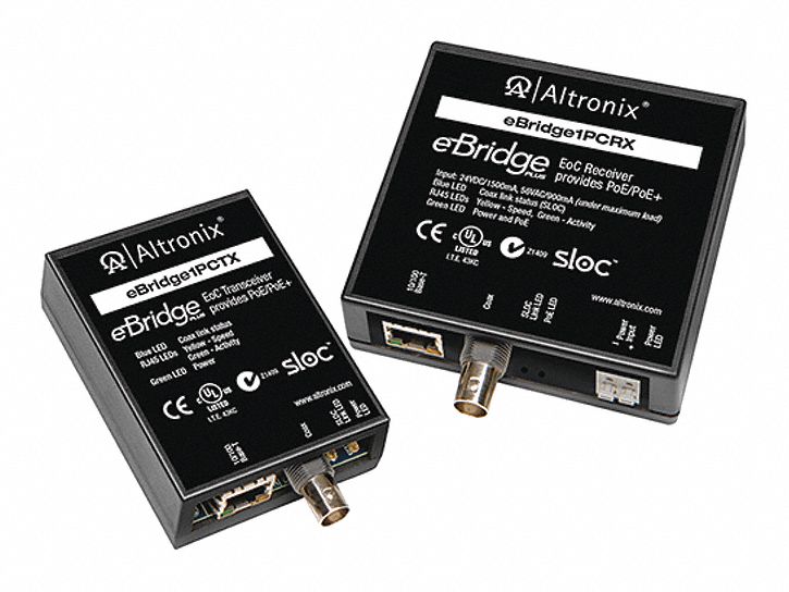 Altronix EBRIDGE16PCRX Series single port EoC Receiver and hardened Transceiver kit transmits data and power over coax cable. Throughput is rated to pass 25Mbps at distances up to 500m.